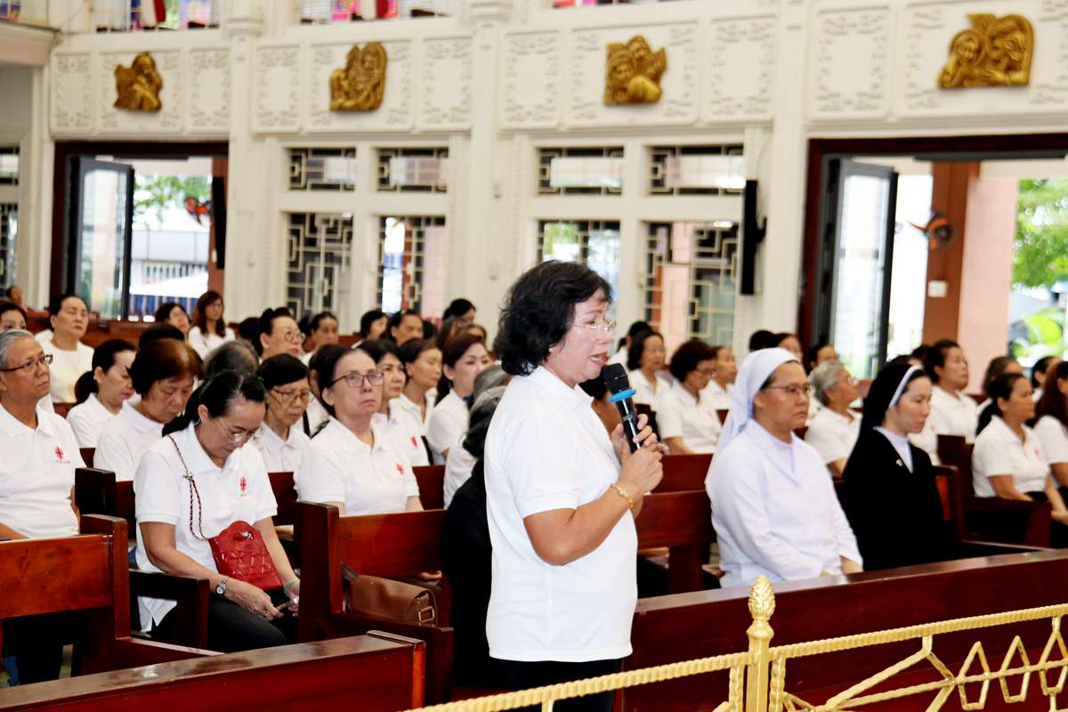 Trước khi Linh mục chủ tế ban phép lành cuối lễ, chị Maria Phạm Thanh Thủy, trưởng Caritas giáo hạt Tân Định có lời tri ân các linh mục đồng tế, các sơ văn phòng Caritas, khách mời cùng các thành viên Caritas giáo hạt Tân Định và bếp ăn Tình thương giáo xứ Vườn Xoài.