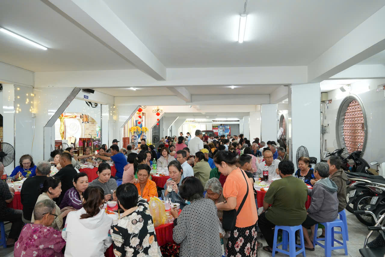 Bữa cơm được dọn ra giản dị, đúng chất Tết quê: súp nóng, bánh chưng, xôi chả, cơm chiên, chả giò, củ kiệu. Không cầu kỳ, nhưng đủ để người tham dự cảm thấy mình được chờ đợi và trân trọng. Trước khi dùng bữa, Cha Sở chúc lành, rồi bà con lần lượt ổn định chỗ ngồi theo sự hướng dẫn của các giáo khu.
