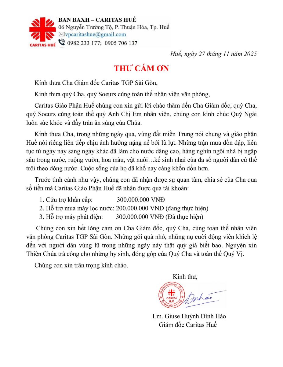 Đáp lại tiếng gọi của tình liên đới, Gia đình Tổng Giáo phận Sài Gòn cùng nhau hướng lòng về miền Trung ruột thịt. Đến ngày 7/11/2025, VP Caritas Sài Gòn đã nhanh chóng chuyển trao phần hỗ trợ đến Caritas các Giáo phận Huế, Đà Nẵng và Quy Nhơn — những nơi chịu ảnh hưởng nặng nề nhất sau bão.