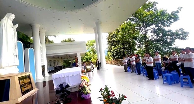 Đúng 09g00, đoàn đến Trung tâm Hành hương Đức Mẹ Tàpao. Sau khi chụp hình lưu niệm, mọi người cùng nhau tiến lên Linh Đài Mẹ.