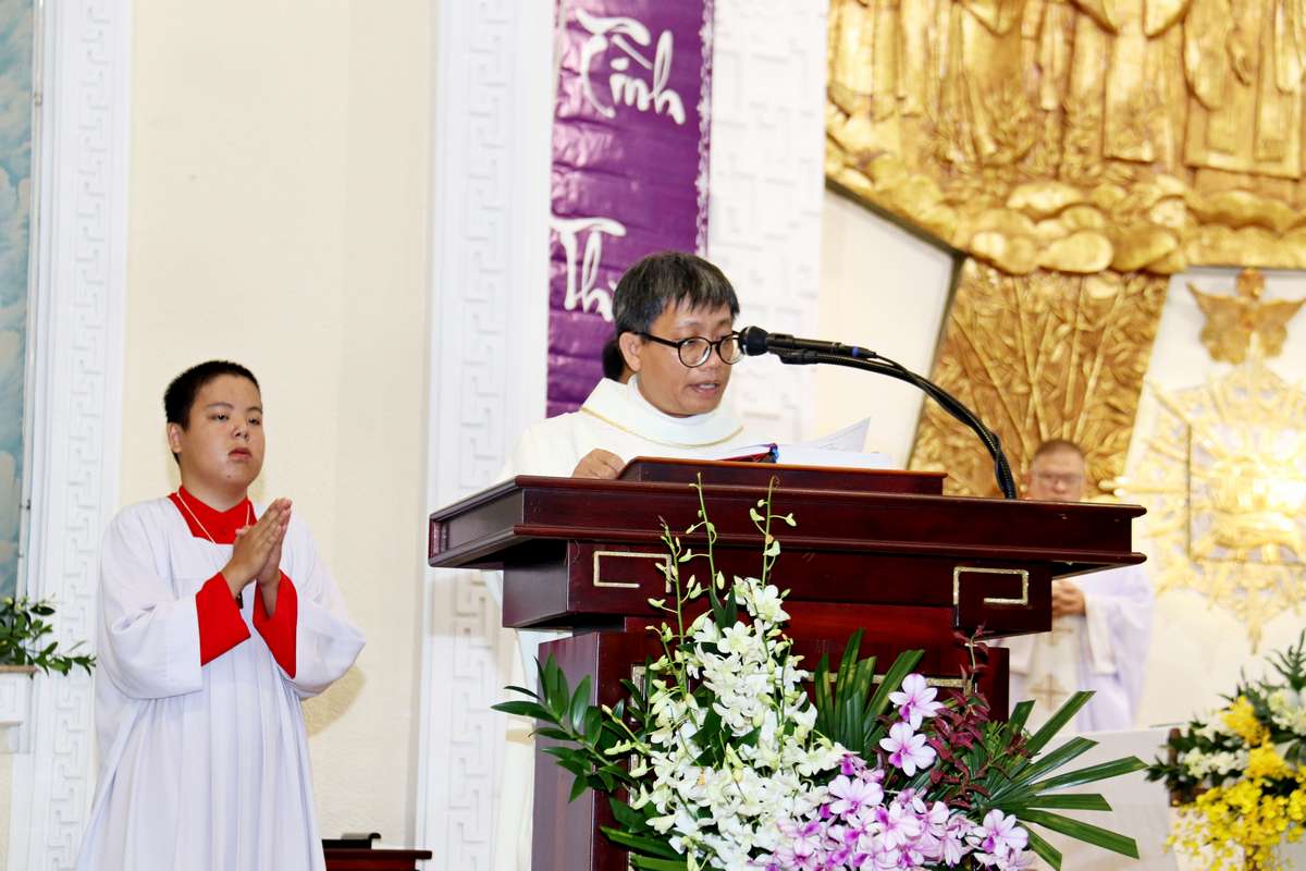 Trước khi Linh mục chủ tế ban phép lành cuối lễ, chị Maria Phạm Thanh Thủy, trưởng Caritas giáo hạt Tân Định có lời tri ân các linh mục đồng tế, các sơ văn phòng Caritas, khách mời cùng các thành viên Caritas giáo hạt Tân Định và bếp ăn Tình thương giáo xứ Vườn Xoài.