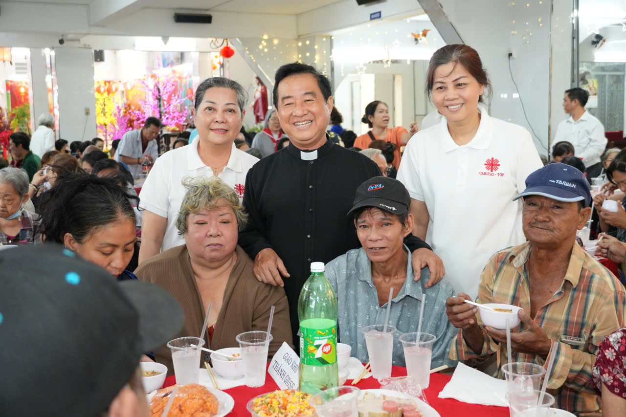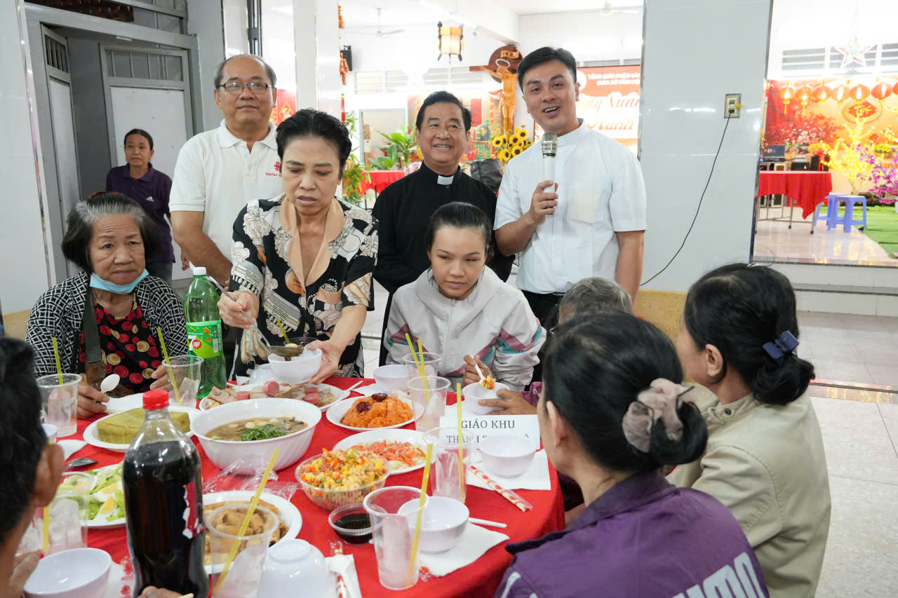 Chia sẻ thêm với cộng đoàn, Cha Phó Anphongsô Nguyễn Hoàng Ngọc Anh nói về tinh thần hiệp hành theo cách rất gần. Cha giải thích: hiệp là cùng nhau, hành là cùng bước đi. Qua đó, Cha nhắn nhủ rằng bữa cơm hôm nay không dành riêng cho ai, bởi Tết là niềm vui chung. Với người Kitô hữu, phục vụ anh chị em cũng chính là đang phục vụ Chúa, và sự sẻ chia ấy không dừng lại trong khuôn viên nhà thờ mà tiếp tục lan tỏa trong đời sống thường ngày.