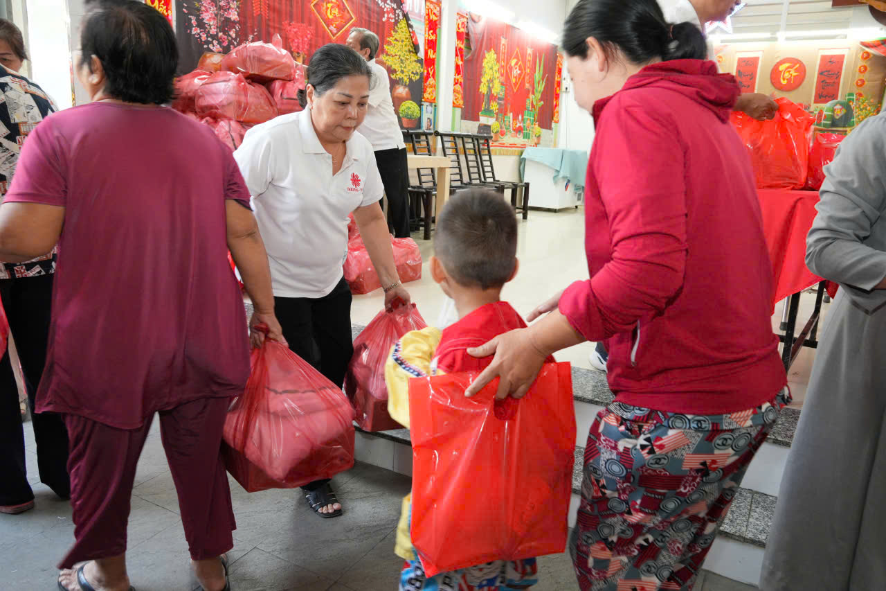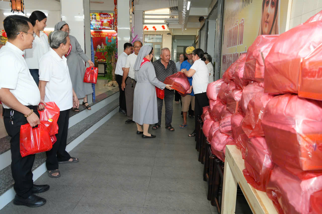 Sau bữa cơm là phần trao quà Tết. Giáo xứ chuẩn bị ba phần quà thiết thực gồm: mì gói - gạo; nước tương - dầu ăn - lạp xưởng; cùng một phong bì nhỏ để bà con lo thêm những ngày đầu năm. Khi các phiếu đã phát hết, vẫn còn một số người tìm đến xin hỗ trợ. Không để ai ra về tay không, giáo xứ nhanh chóng sử dụng phần dự trữ là mì gói và gạo để trao thêm - một quyết định vội nhưng đầy tình người.