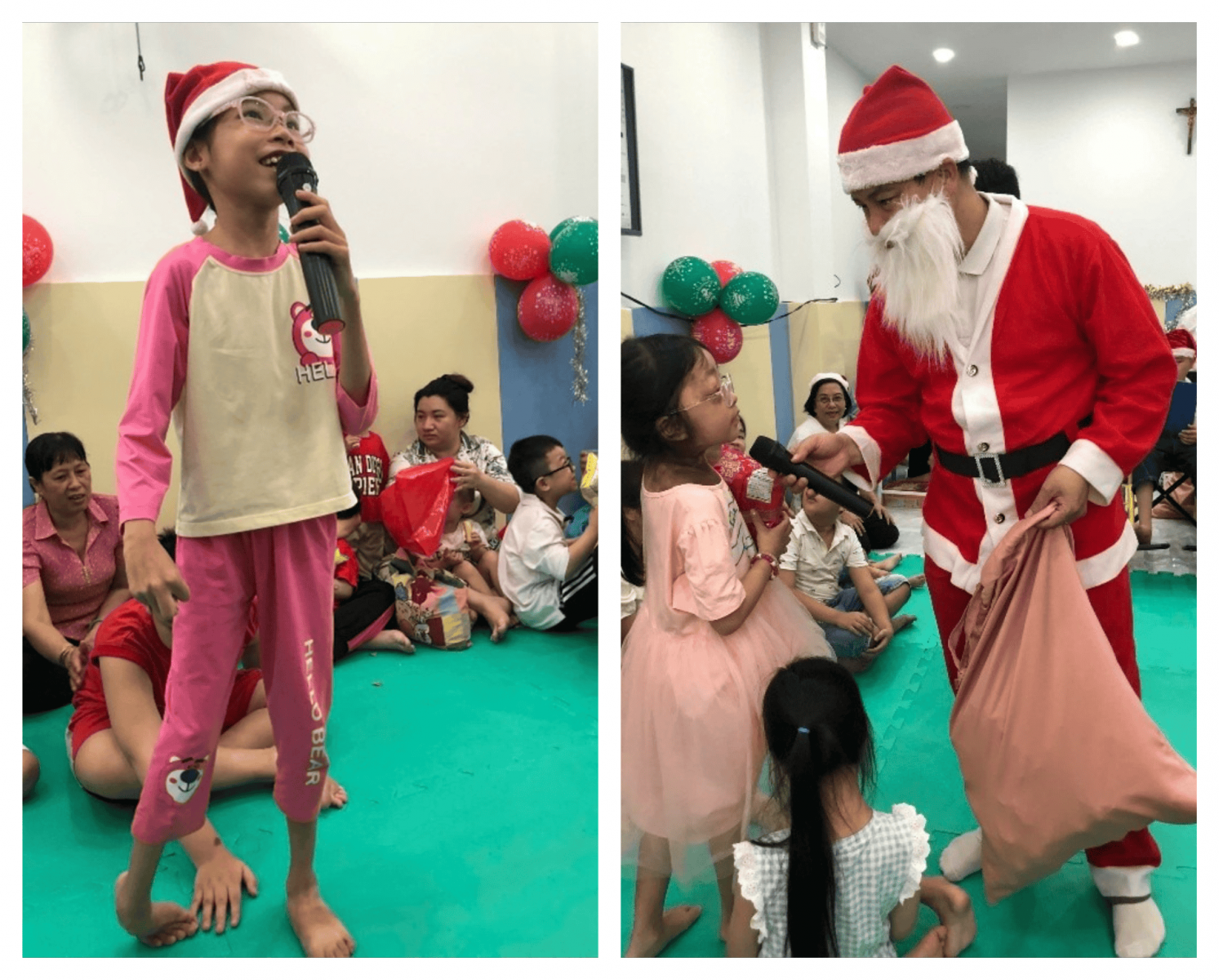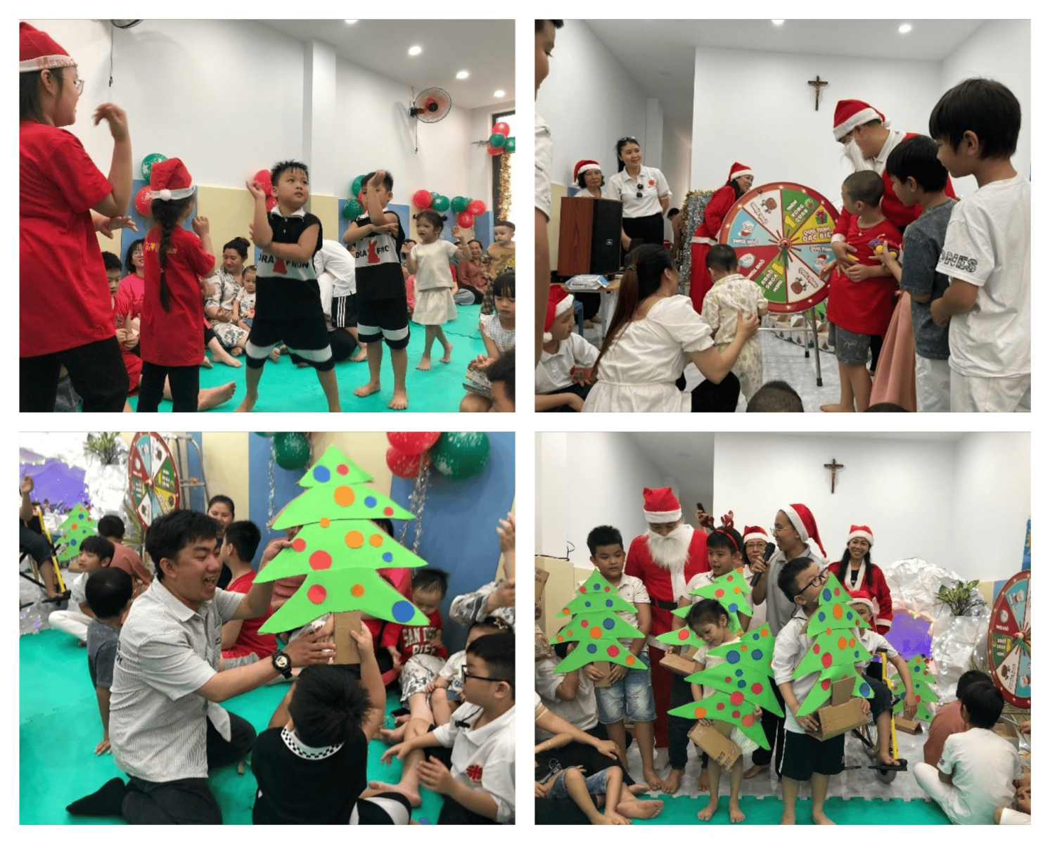 Niềm vui bùng nổ khi Ông già và Bà già Noel xuất hiện trong tiếng reo hò của các em. Những tiết mục văn nghệ “cây nhà lá vườn” của các bé Thanh Ngân, Gia Hân, Gia Mẫn… mang đến sự gần gũi và đáng yêu. Xen kẽ là các trò chơi như gắn cây thông, vòng quay may mắn, hỏi đáp Giáng Sinh – khiến các em hào hứng tham gia.