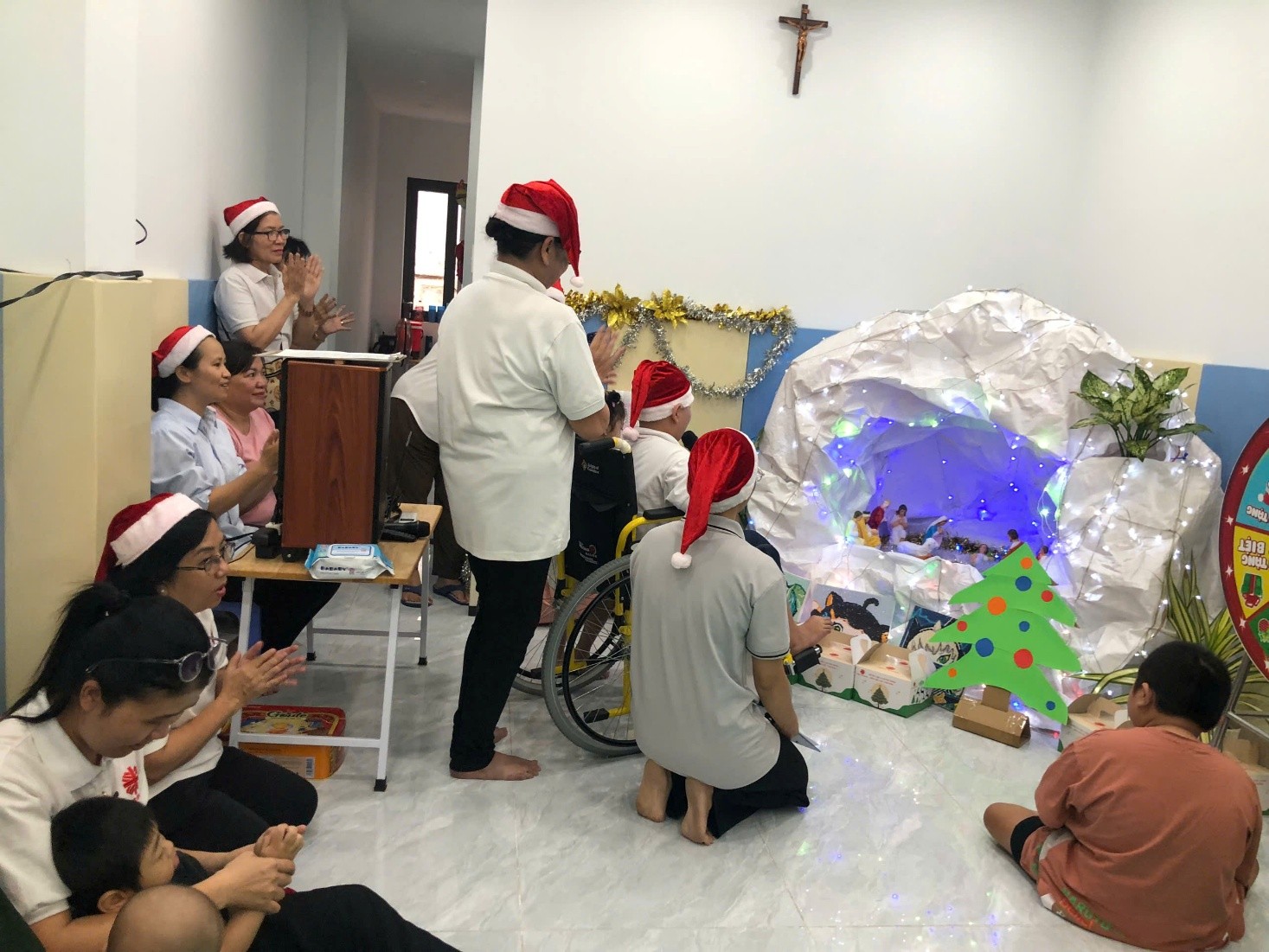 Không gian Giáng Sinh được chuẩn bị chu đáo từ nhiều ngày trước. Hang đá, cây thông và phòng sinh hoạt đều được trang hoàng bằng tấm lòng của phụ huynh và các cộng tác viên, tạo nên bầu khí ấm áp cho ngày gặp gỡ.